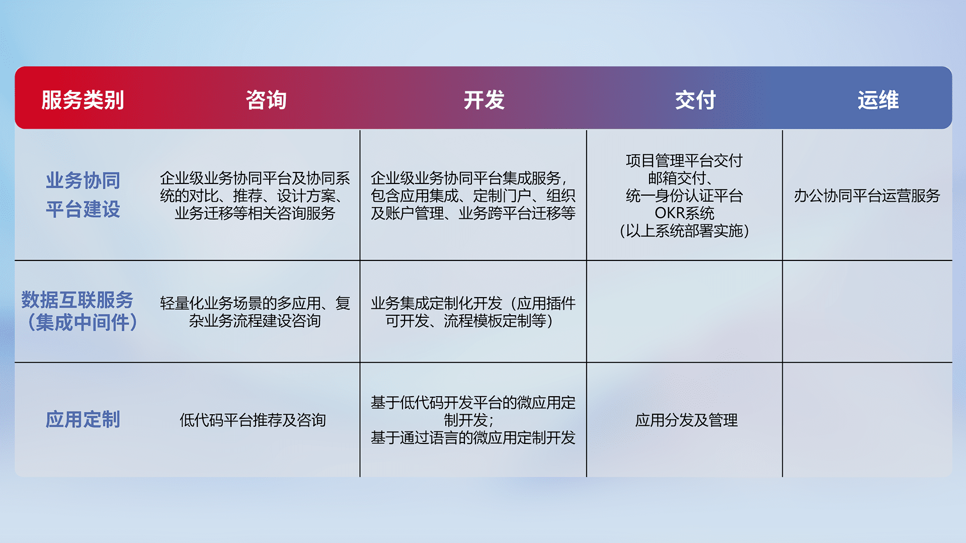 针对钉钉、、、企微、、、IDaas等平台级产品提供产品的规划、、、方案、、、、交付、、、、定制化开发等服务,,,,实现如统一协同办公、、、智能客户服务、、、混合会议管理、、、、智能数据查询、、、、等业务场景,,实现数字化转型。。。